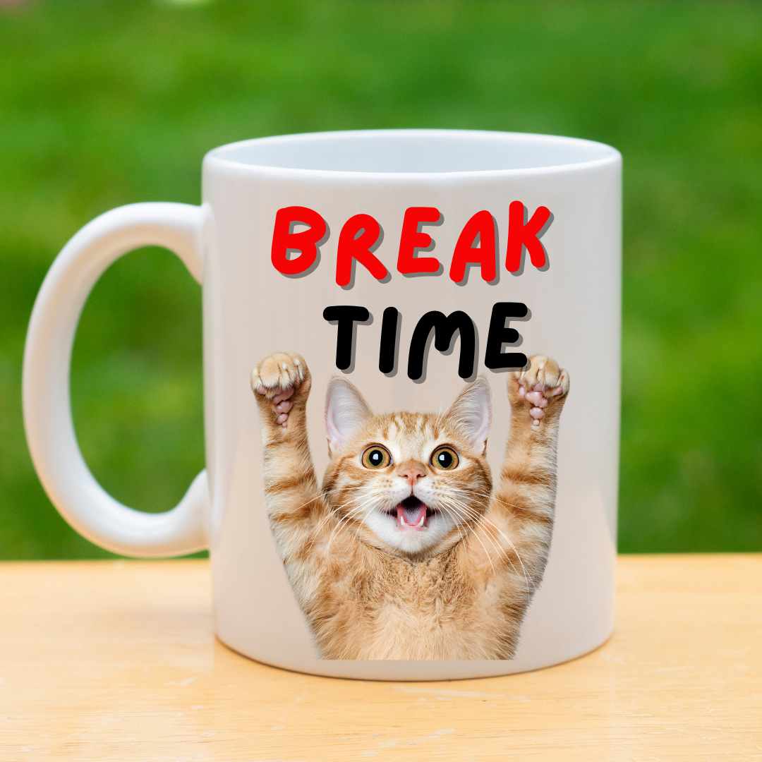 Savor your perfect moment of peace with this adorable 'Break Time with a Happy Cat' mug! This charming mug is the ideal companion for your afternoon tea, morning coffee, or that much-needed moment of relaxation.