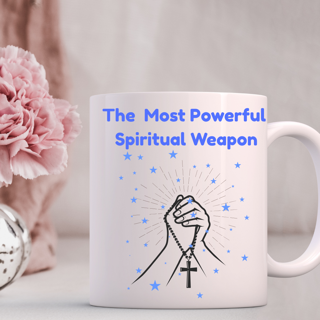 This beautiful Catholic-themed mug features our Blessed Mother and the powerful spiritual weapon, The Rosary. It’s a truly adorable and religious design.